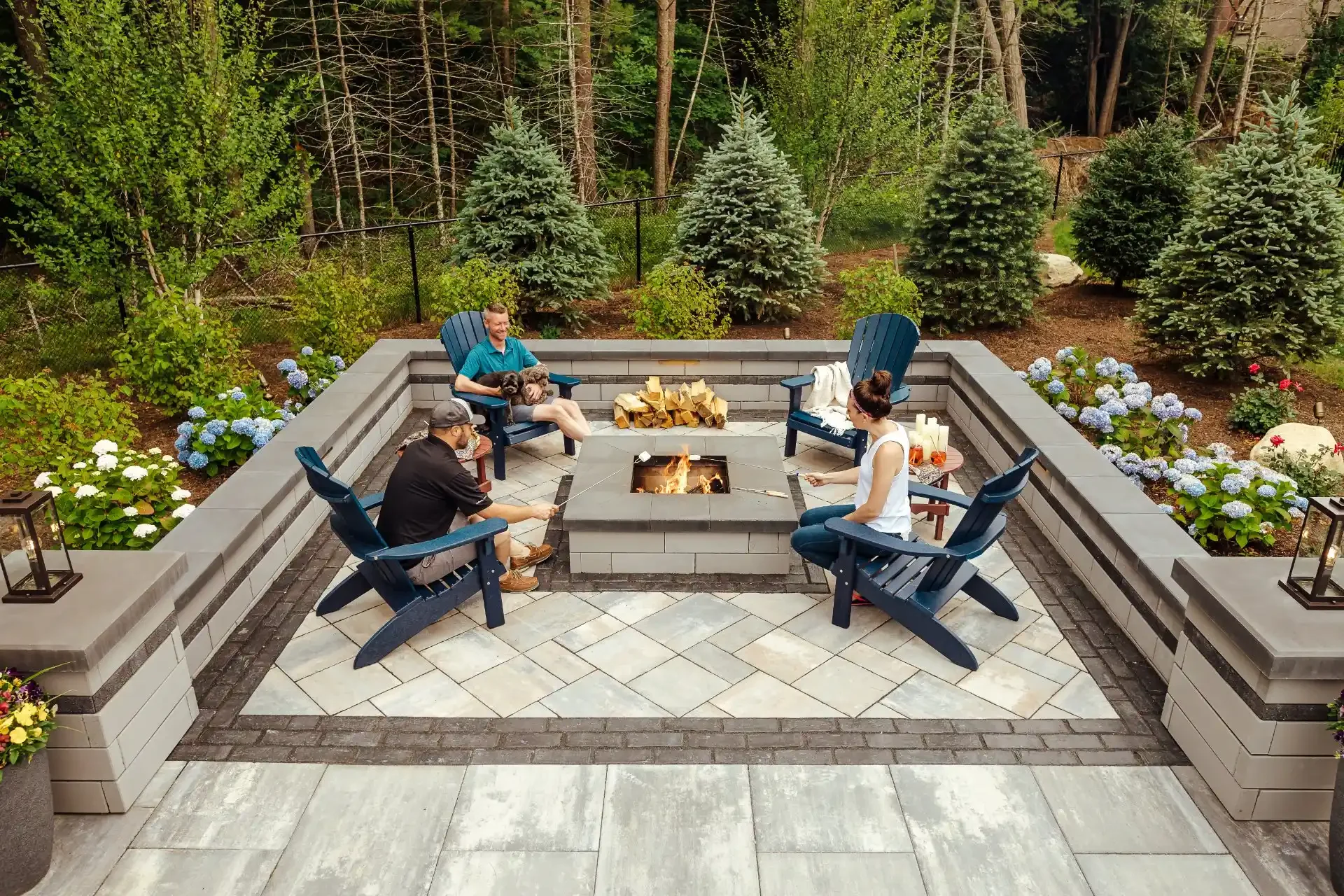 The sunken fire pit lounge sits slightly below the main patio grade, with built-in stack-stone seat walls, planters, Adirondack chairs, and a smokeless gas fire pit. Evergreens press in close on all sides, creating a more private sense of retreat.